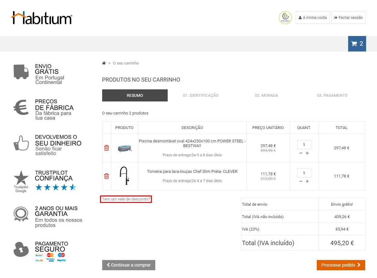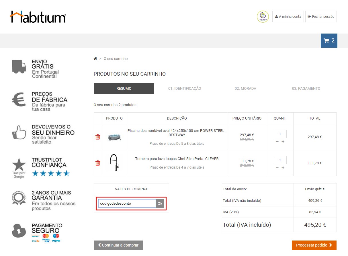 Se o código estiver correto e tiver iniciado sessão na sua conta, a página irá ser atualizada e aparecerá a quantidade descontada e a alteração efetuada pela mesma no preço do pedido.