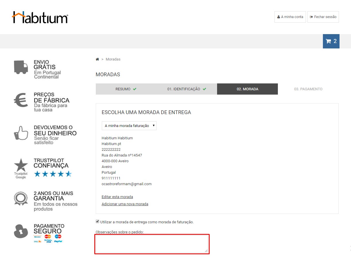 Durante o processo de processamento do seu pedido encontrará um campo dedicado a comentários. Nesse campo deverá escrever qualquer aspeto ou informação que deva ser tida em conta relativamente ao seu pedido.
