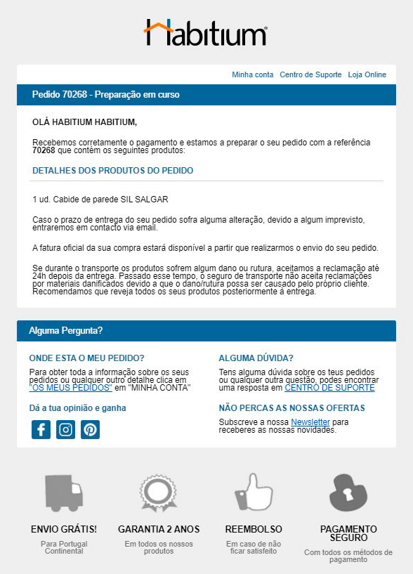 Para que os clientes possam saber se recebemos corretamente o seu pedido, é enviado um email de confirmação com o assunto [Habitium] Detalhes do pedido, onde poderá encontrar o número do seu pedido (4 dígitos), o produto ou produtos que constituem o pedido, o preço final, a morada de entrega e de faturação.