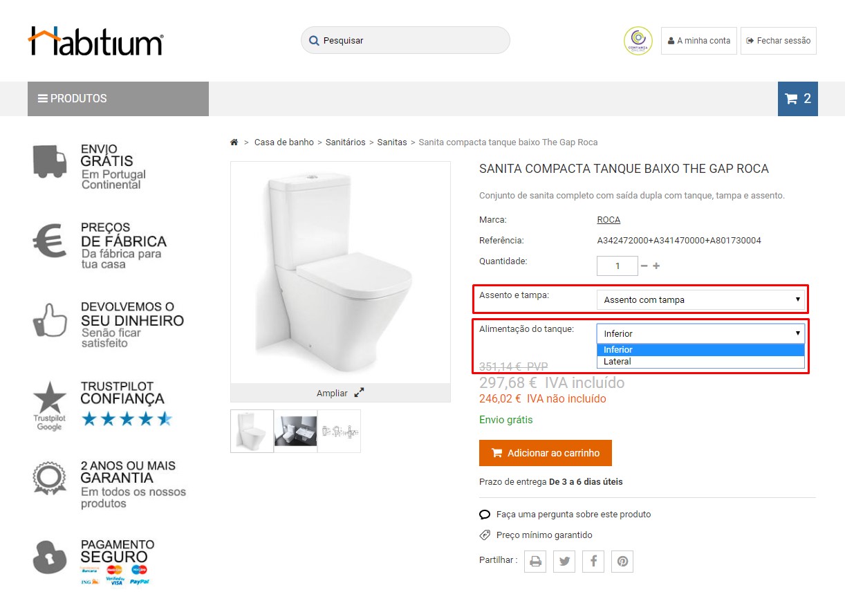 A maioria dos produtos da nossa página web dão-lhe a possibilidade de escolher entre vários acabamentos, formatos, combinações, além da opção de adicionar alguns acessórios. Estas opções encontram-se sempre na mesma zona da página, independentemente do produto, no lado direito da imagem principal. Estas são apresentadas em secções onde pode escolher a opção que melhor se adapte às suas necessidades (sinalizadas a vermelho na imagem ilustrativa). Uma vez selecionada uma opção, o preço alterar-se-á tendo em conta a mesma.